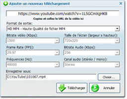 Maintenant, vous pouvez voir la fenêtre "Ajouter un nouveau téléchargement". Sélectionnez un format de sortie dans la liste (MP4, MP3 ou AVI, etc), puis cliquez sur le bouton "Télécharger" pour lancer le téléchargement. Vous pouvez également définir les paramètres vidéo comme le bitrate, le canal audio ou le dossier de téléchargement.